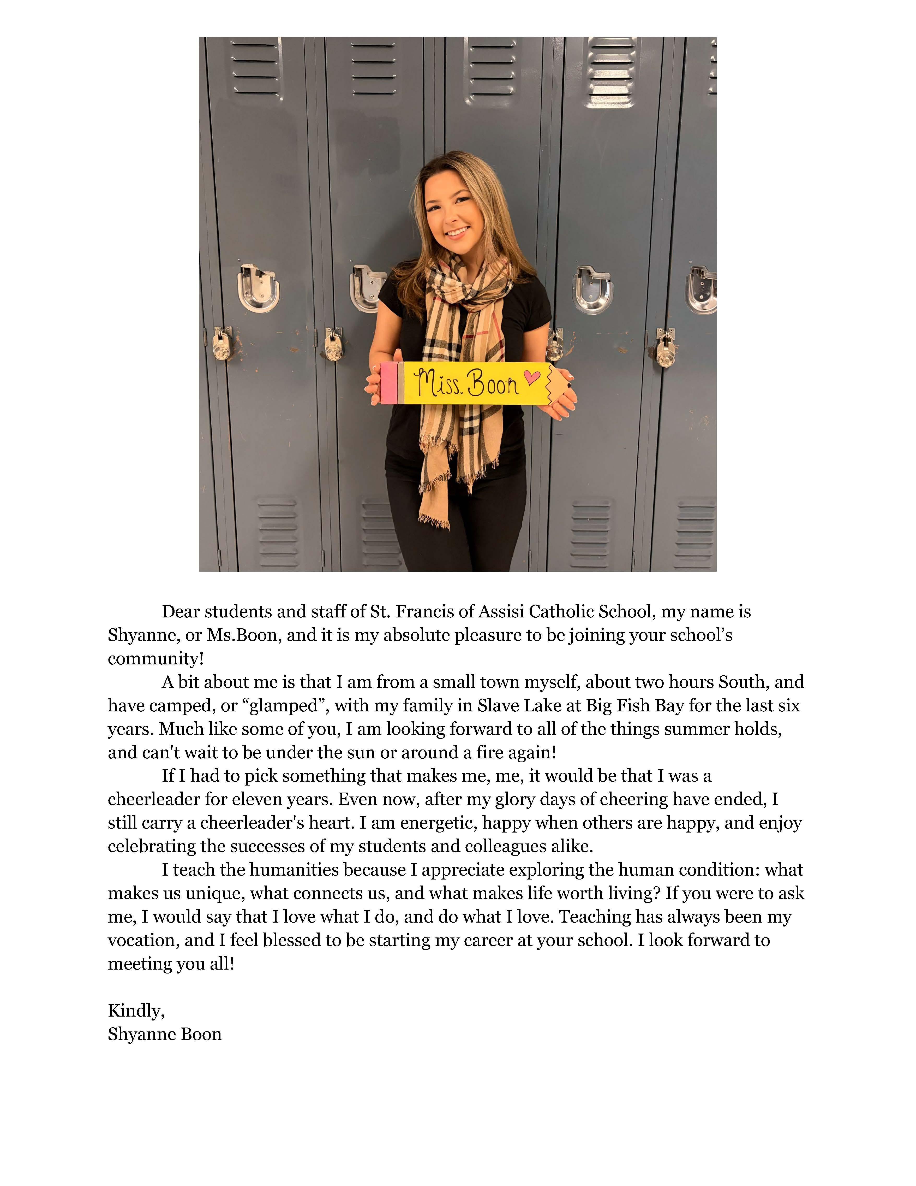 Please welcome Ms. Boon to our St. Francis community for the 2026.2027 school year!